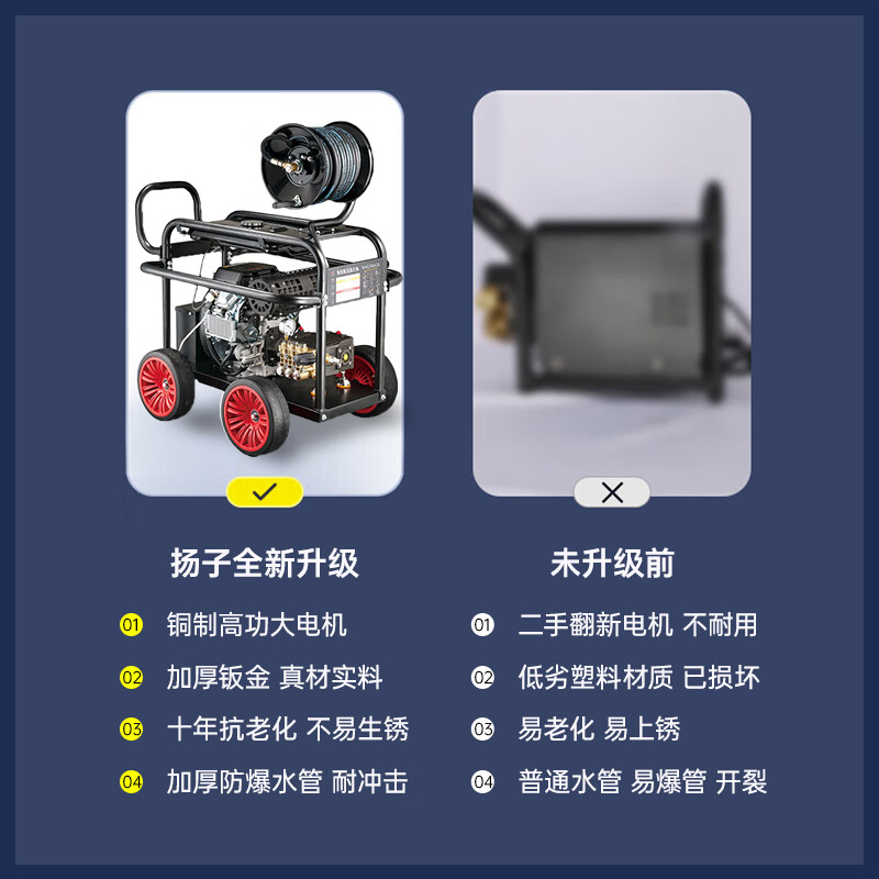 管道疏通機就選揚子,一臺機器兩種用處,配備3中型號噴頭,適用于多種場景應用,動力強水流大,通暢無阻拐彎無壓力