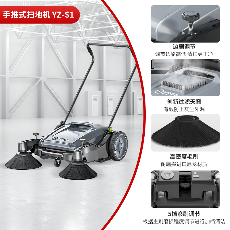 揚子YZ-S1手推式掃地機主要依靠滾刷、邊刷來完成清掃工作,結構相對簡單,操作方便快捷, 整機不需要任何電動助力,不用油、不用電,只需步行推動就能把垃圾輕松回收到垃圾箱,可以清掃